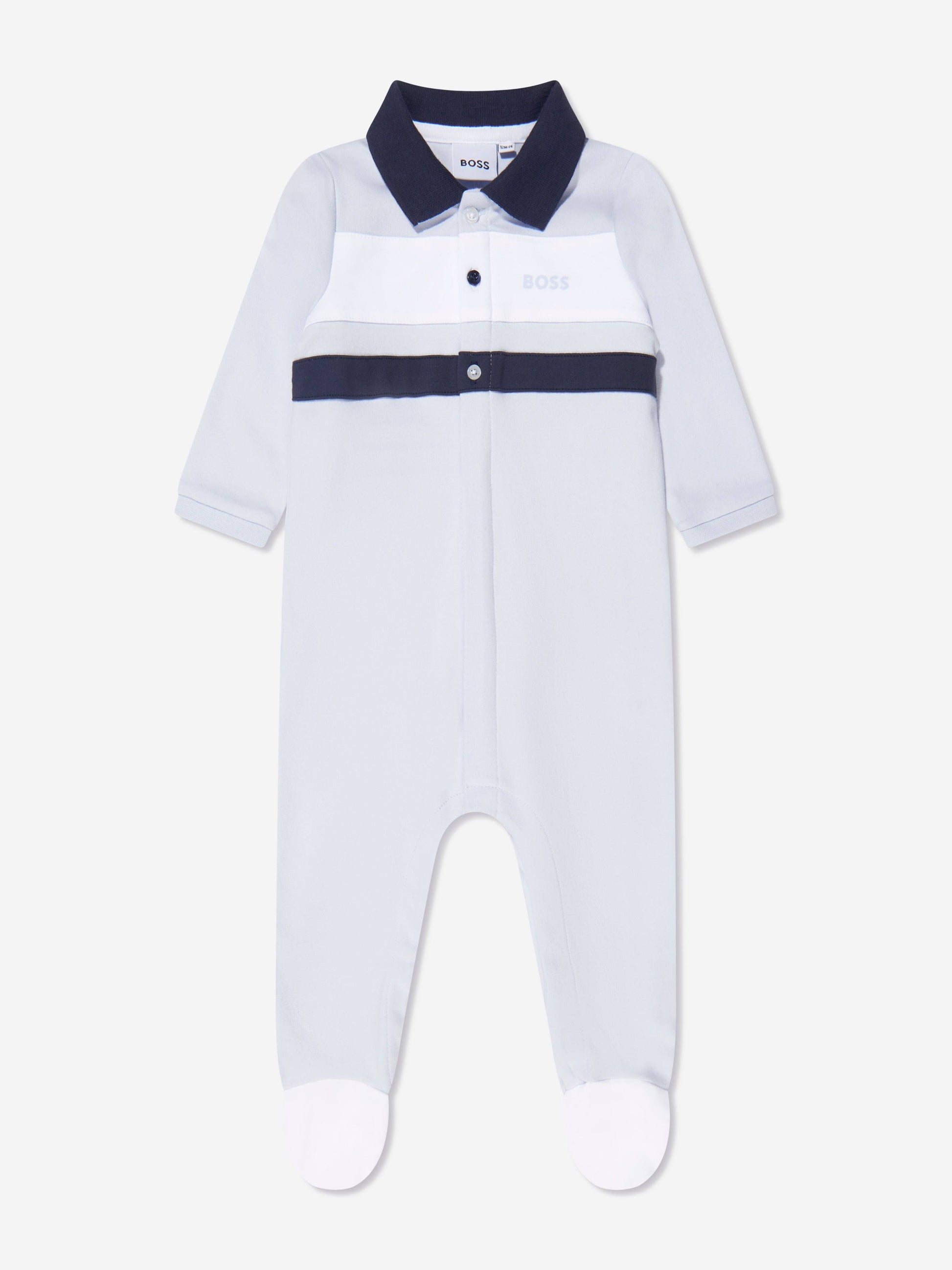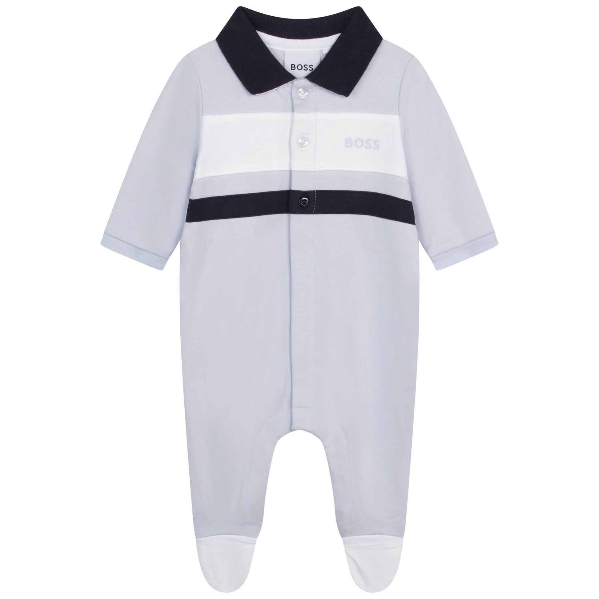 Një kostum gjumi super i butë për bebe, i projektuar nga BOSS me një jakë polo dhe me vija dhe logo