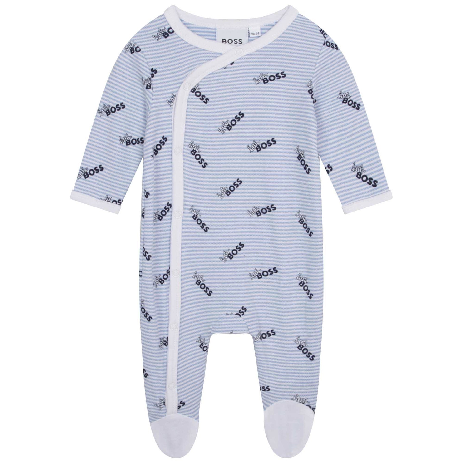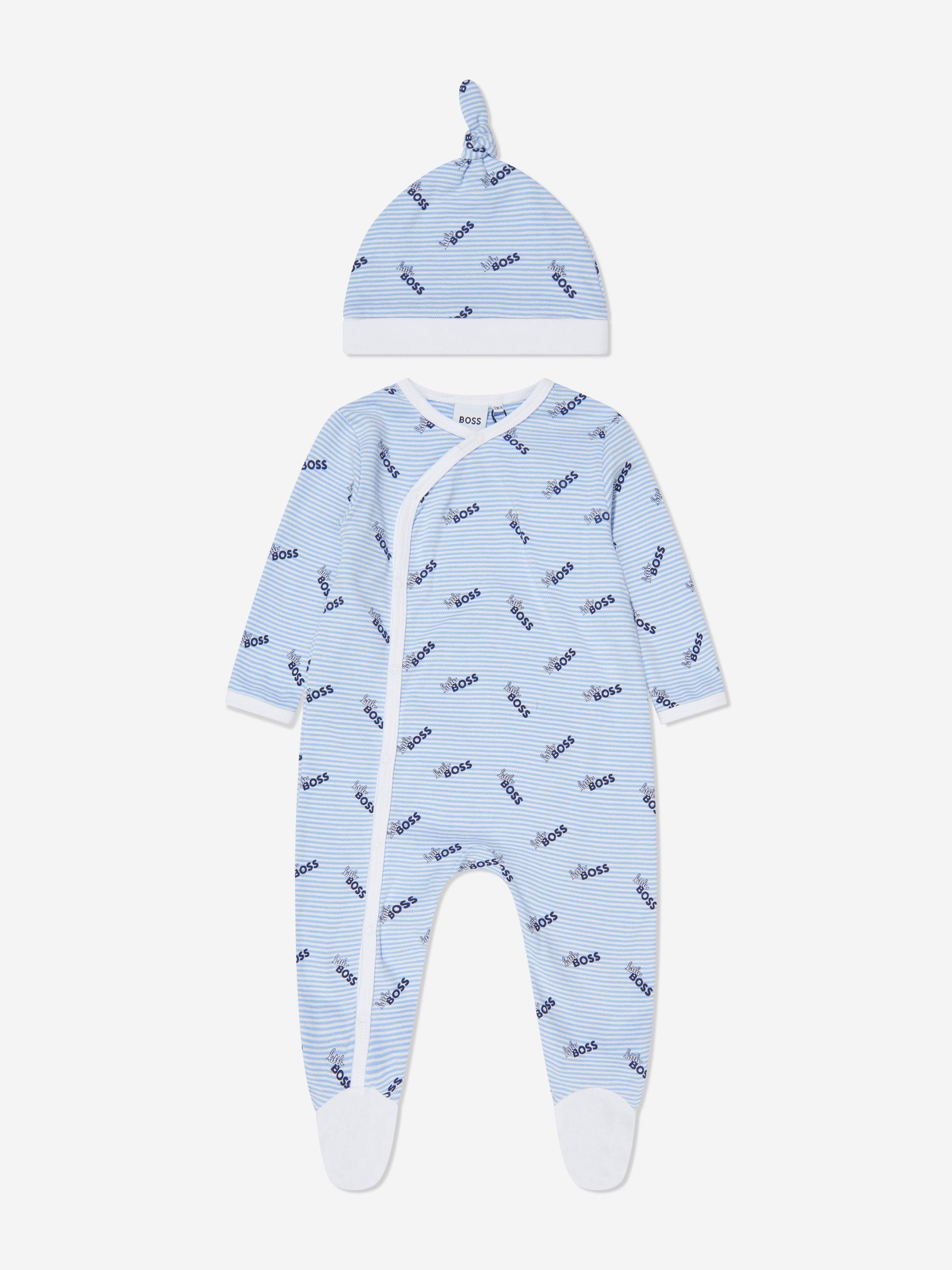 Një set për foshnja nga BOSS, i punuar dhe i përbërë nga një kapele e lezetshme me vija dhe logo dhe një kostum gjumi .