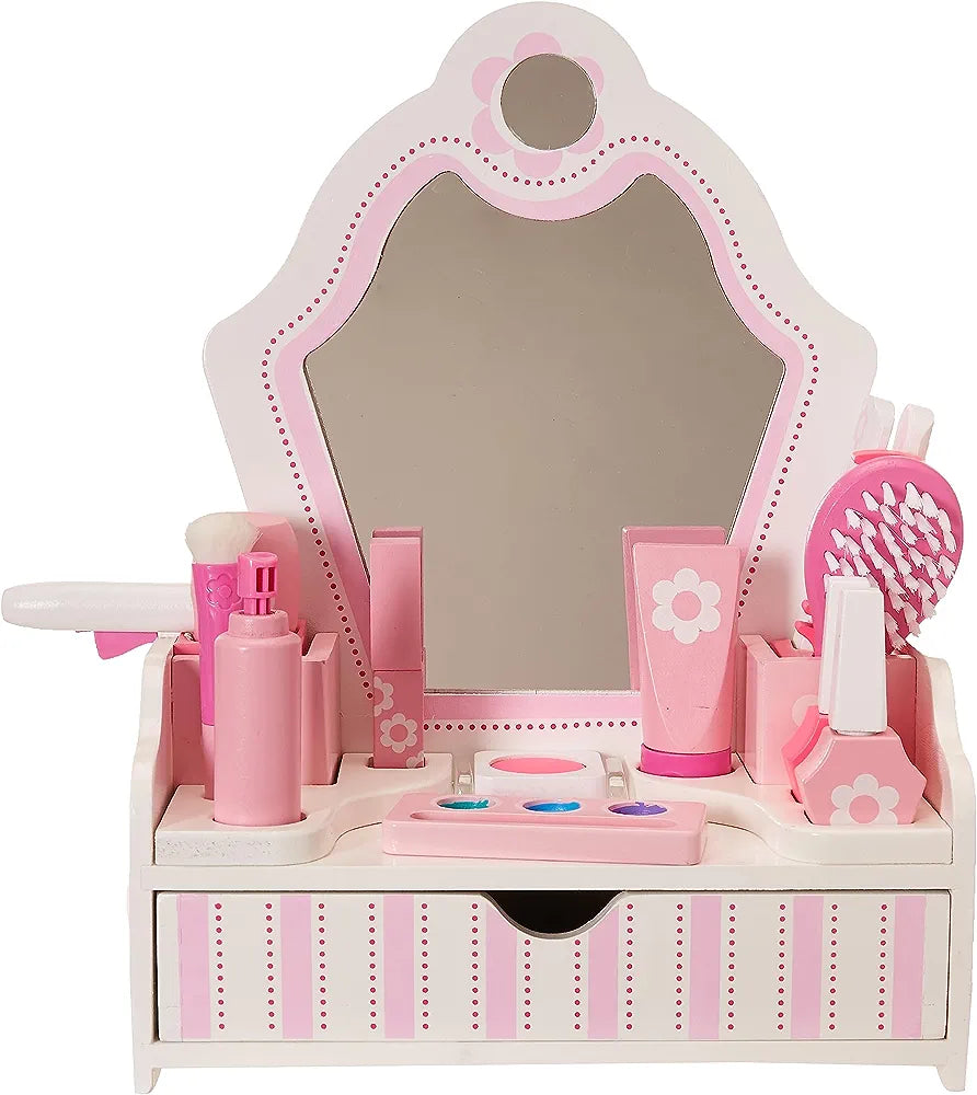 KONSTRUKSION TË QËNDRUESHËM NGA DRURI: Seti i lojërave të sallonit të bukurisë Melissa & Doug vjen me një komodë të qëndrueshme prej druri, që përfshin një pasqyrë të sigurt për fëmijët dhe sirtar ruajtjeje.