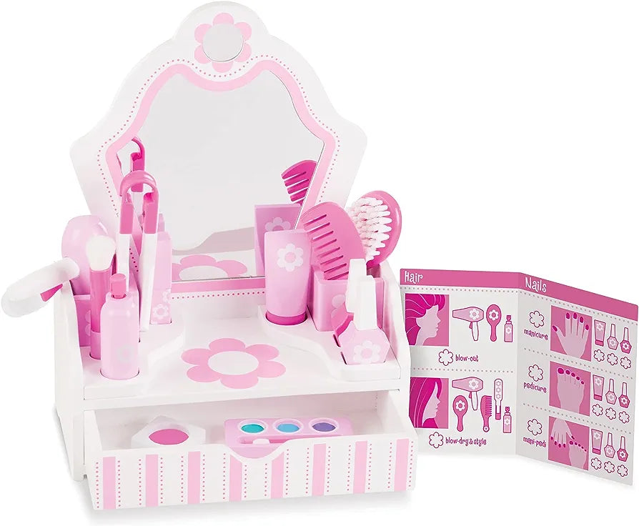 BUKURIA E NXITJES IMAGJINATIVE: Seti I lojes së Salloneve të Bukurisë Melissa & Doug Wooden është një set 18-copësh për fëmijë për grim, flokë dhe thonjtë e salloneve të bukurisë për lojëra.